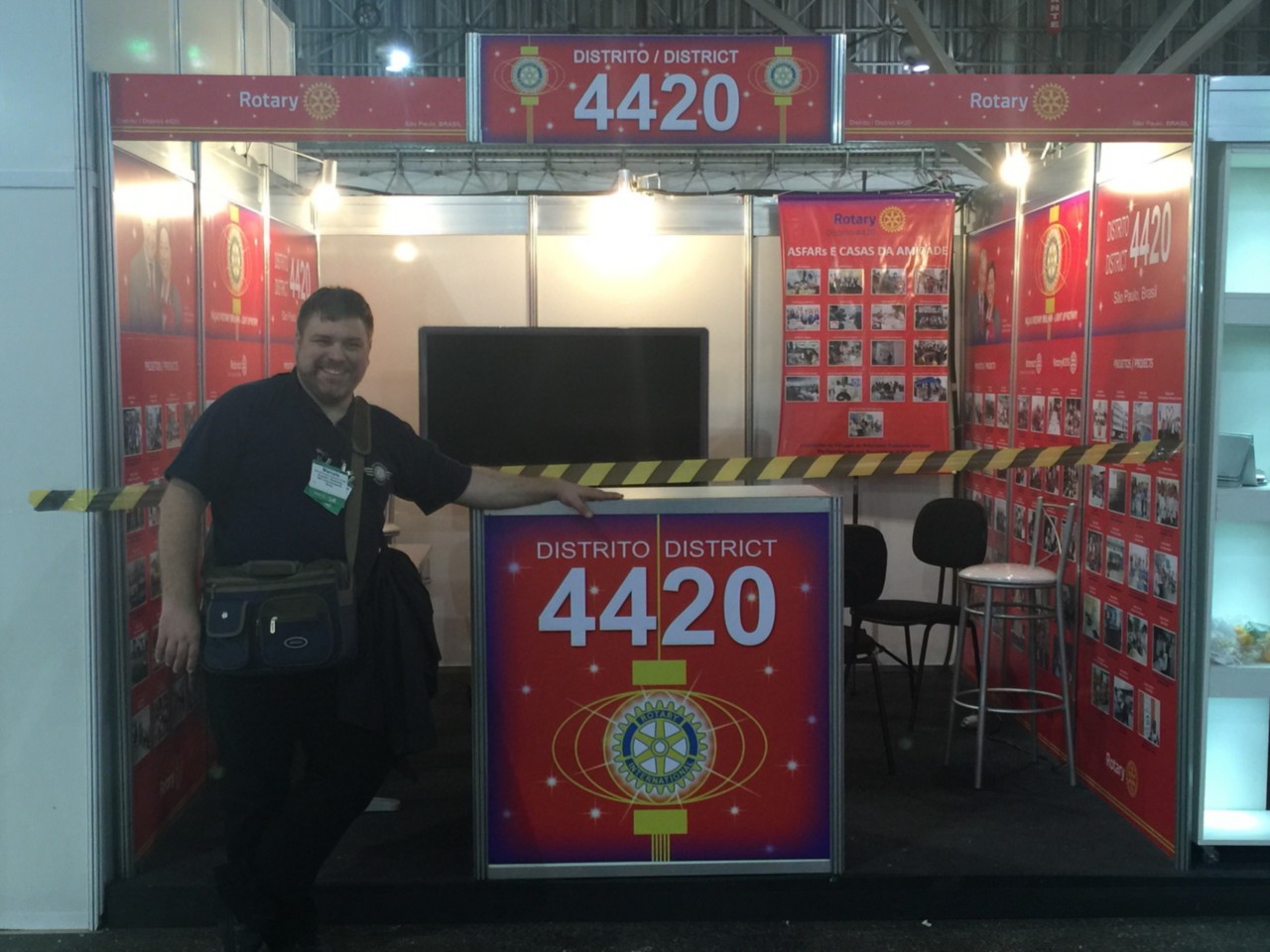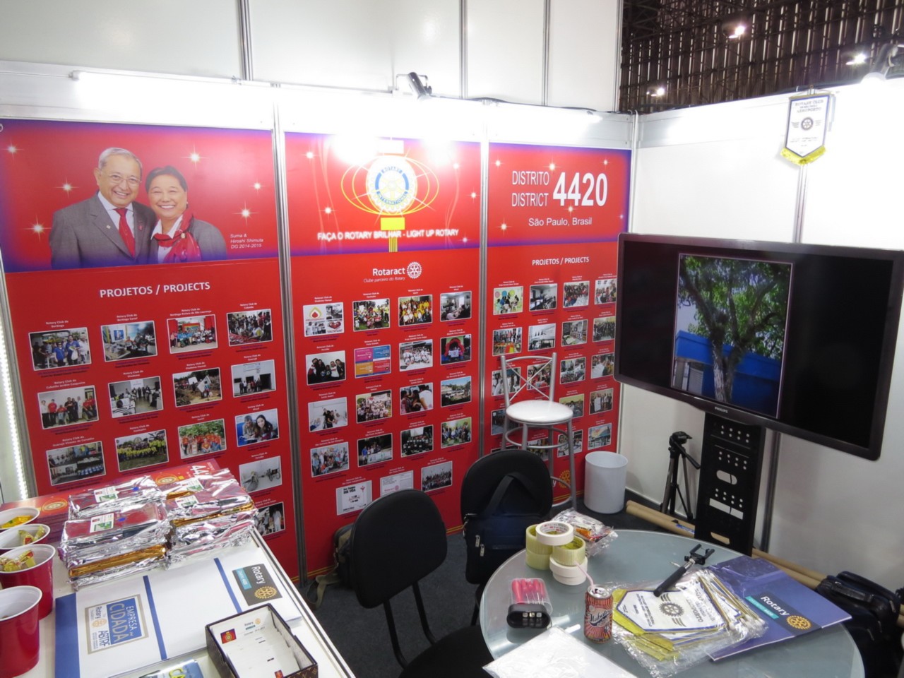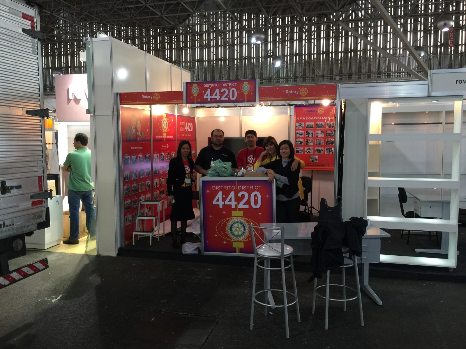 Nas fotos imagens da preparação final para o evento, e a equipe de montagem do stand do Distrito 4420.