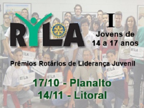 O RYLA, Prêmios Rotários de Liderança Juvenil, em sua edição para jovens de 14 a 17 anos, será realizado em duas datas, uma em 17/10 para os jovens de São Paulo e ABC (Planalto) e outra em 14/11 para os jovens do litoral (Baixada).