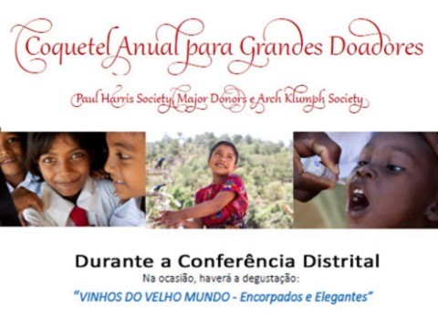 Durante a Conferência Distrital Presente, em Águas de Lindoia, ocorrerá o tradicional Coquetel Anual para Grandes Doadores, em reconhecimento aos membros da Paul Harris Society, Major Donors e membros da Arch Klumph Society.