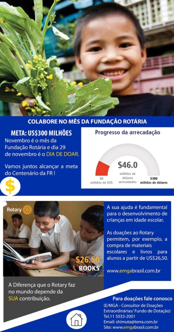 Para isso, devemos lembrar nossos companheiros de todo o Brasil a importância da contribuição de cada um. Lembrem-se que as Grandes Doações são de grande importância para este objetivo. Como líder de sua região/ distrito, devemos destacar a Diferença que o Rotary promove na vida de milhões de pessoas no mundo todo.