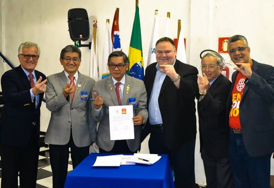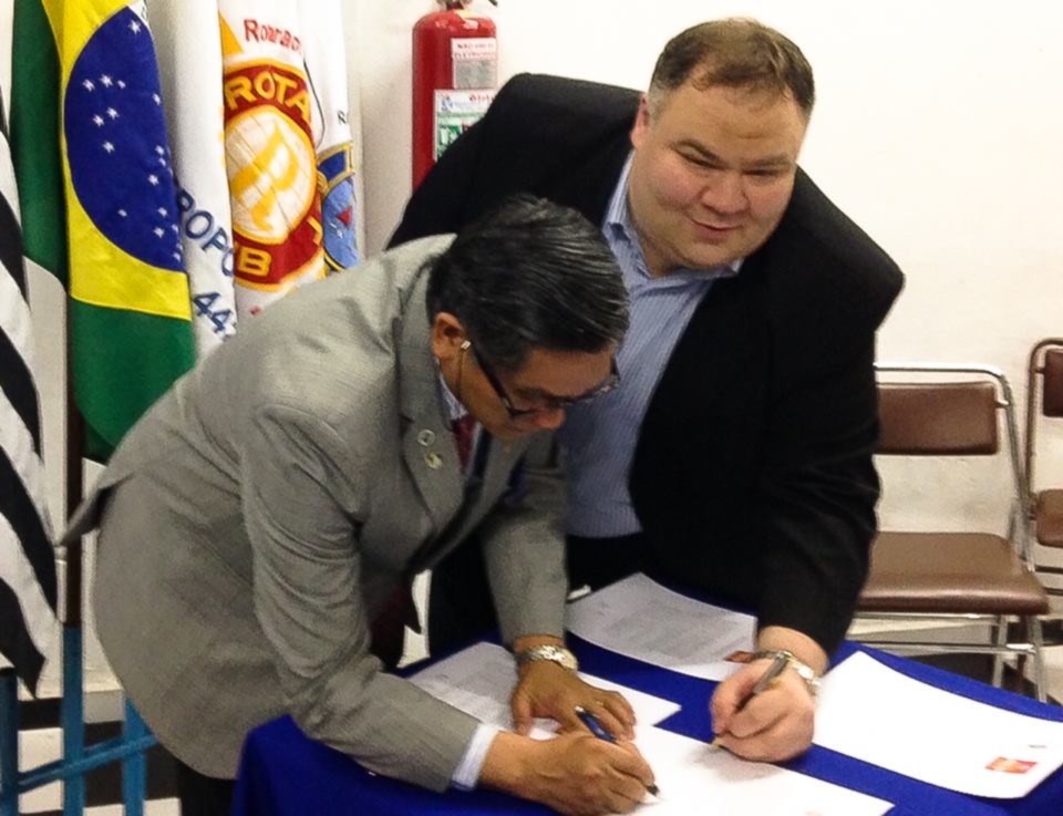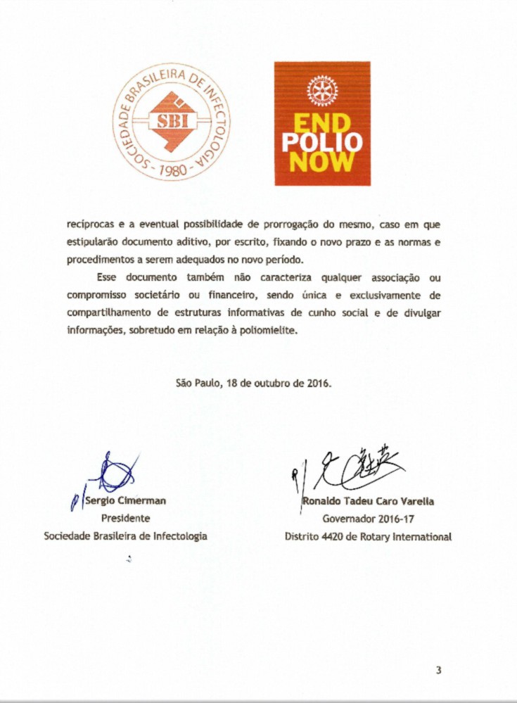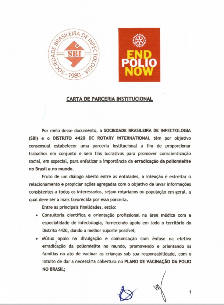 Assinatura do termo de parceria entre o Distrito 4420 e a SBI - Sociedade Brasileira de Infectologia, para proporcionar trabalhos em conjunto, promover conscientização social, e em especial para enfatizar a importância da erradicação da poliomielite no Brasil e no mundo.