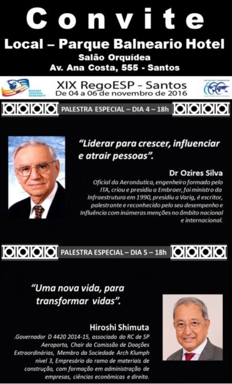 O Distrito 4420 está organizando a XIX RegoEsp ? Reunião dos Governadores do Estado de São Paulo, e convida todos os rotarianos interessados para as 2 palestras especiais que ocorrerão durante o evento: