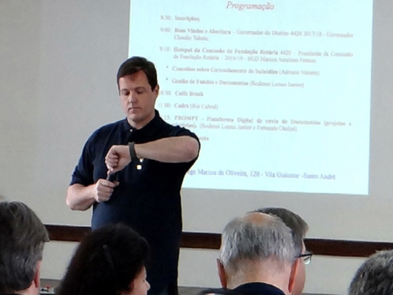 O governador eleito para o ano rotário 2017-2018 Claudio Hiroshi Takata abriu os trabalhos do dia. Além dos presidentes de clubes e da Comissão de Fundação Rotária o Seminário contou com a presença do presidente da Comissão de Fundação Rotária Marcos Franco, EGD Maria Luiza Zago, Governador Indicado Carlos Torci, Instrutores Distritais e Membros do CADRE. A novidade é que os pedidos de Subsídios Distritais, seu acompanhamento e prestação de contas serão efetuados de forma digital.
